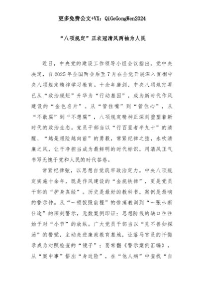 【七哥公文】2025年:“八项规定”正衣冠清风两袖为人民+更多免费公文+VX:QiGeGongWen2024+更多免费公文+VX:QiGeGongWen2024