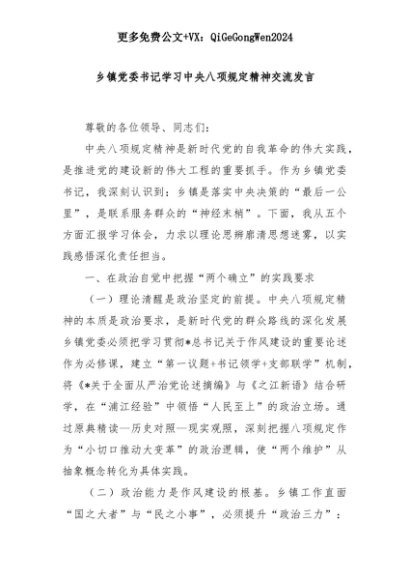【七哥公文】2025年:乡镇党委书记学习中央八项规定精神交流发言+更多免费公文+VX:QiGeGongWen2024+更多免费公文+VX:QiGeGongWen2024