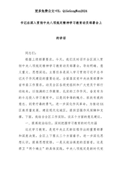 【七哥公文】2025年:书记在深入贯彻中央八项规定精神学习教育动员部署会上的讲话+更多免费公文+VX:QiGeGongWen2024+更多免费公文+VX:QiGeGongWen2024