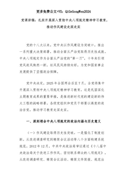 【七哥公文】2025年:党课讲稿:扎实开展深入贯彻中央八项规定精神学习教育,推动作风建设走深走实+更多免费公文+VX:QiGeGongWen2024+更多免费公文+VX:QiGeGongWen2024