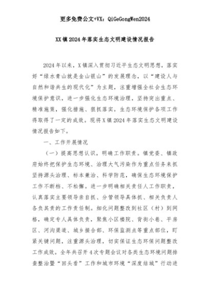 【七哥公文】2025年:XX镇2024年落实生态文明建设情况报告+更多免费公文+VX:QiGeGongWen2024+更多免费公文+VX:QiGeGongWen2024
