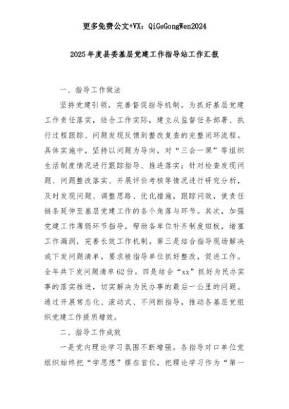 【七哥公文】2025年:2025年度县委基层党建工作指导站工作汇报+更多免费公文+VX:QiGeGongWen2024+更多免费公文+VX:QiGeGongWen2024