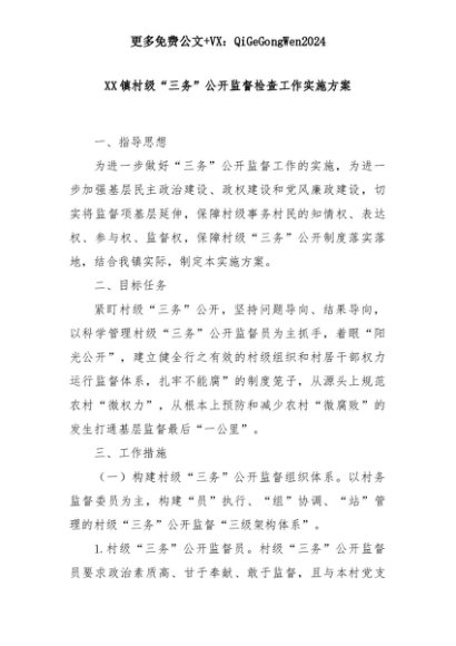 【七哥公文】2025年:XX镇村级“三务”公开监督检查工作实施方案+更多免费公文+VX:QiGeGongWen2024+更多免费公文+VX:QiGeGongWen2024