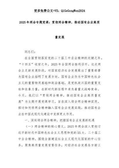 【七哥公文】2025年:2025年两会专题党课:贯彻两会精神,推动国有企业高质量发展+更多免费公文+VX:QiGeGongWen2024+更多免费公文+VX:QiGeGongWen2024