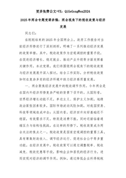 【七哥公文】2025年:2025年两会专题党课讲稿:两会视角下的税收政策与经济发展+更多免费公文+VX:QiGeGongWen2024+更多免费公文+VX:QiGeGongWen2024