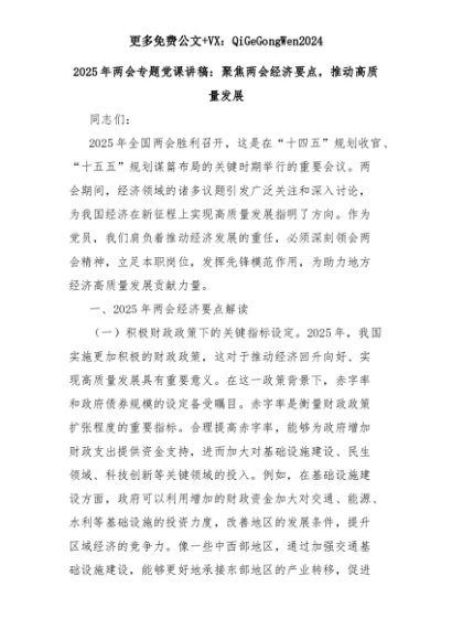 【七哥公文】2025年:2025年两会专题党课讲稿:聚焦两会经济要点,推动高质量发展+更多免费公文+VX:QiGeGongWen2024+更多免费公文+VX:QiGeGongWen2024