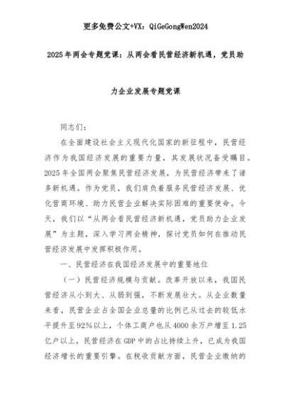 【七哥公文】2025年:2025年两会专题党课:从两会看民营经济新机遇,党员助力企业发展专题党课+更多免费公文+VX:QiGeGongWen2024+更多免费公文+VX:QiGeGongWen2024