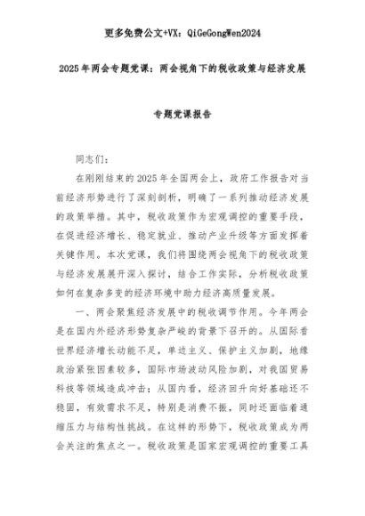 【七哥公文】2025年:2025年两会专题党课:两会视角下的税收政策与经济发展专题党课报告+更多免费公文+VX:QiGeGongWen2024+更多免费公文+VX:QiGeGongWen2024