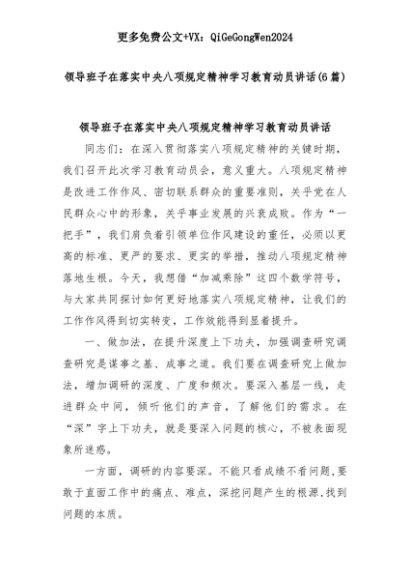 【七哥公文】2025年:(6篇)领导班子在落实中央八项规定精神学习教育动员讲话+更多免费公文+VX:QiGeGongWen2024+更多免费公文+VX:QiGeGongWen2024