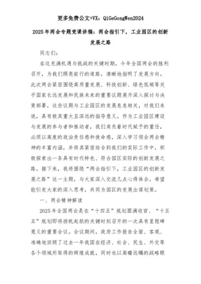【七哥公文】2025年:2025年两会专题党课讲稿:两会指引下,工业园区的创新发展之路+更多免费公文+VX:QiGeGongWen2024+更多免费公文+VX:QiGeGongWen2024
