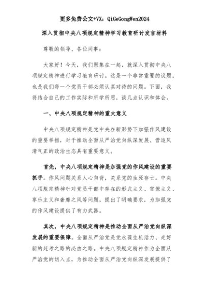 【七哥公文】2025年:深入贯彻中央八项规定精神学习教育研讨发言材料+更多免费公文+VX:QiGeGongWen2024+更多免费公文+VX:QiGeGongWen2024