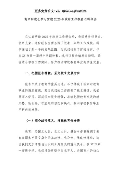 【七哥公文】2025年:高中副校长学习贯彻2025年政府工作报告心得体会+更多免费公文+VX:QiGeGongWen2024+更多免费公文+VX:QiGeGongWen2024