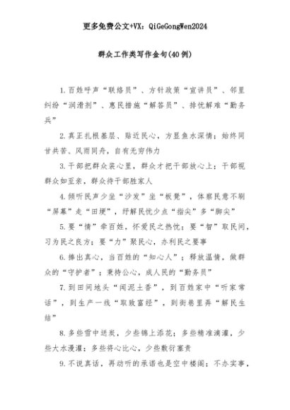 【七哥公文】2025年:(40例)群众工作类写作金句+更多免费公文+VX:QiGeGongWen2024+更多免费公文+VX:QiGeGongWen2024