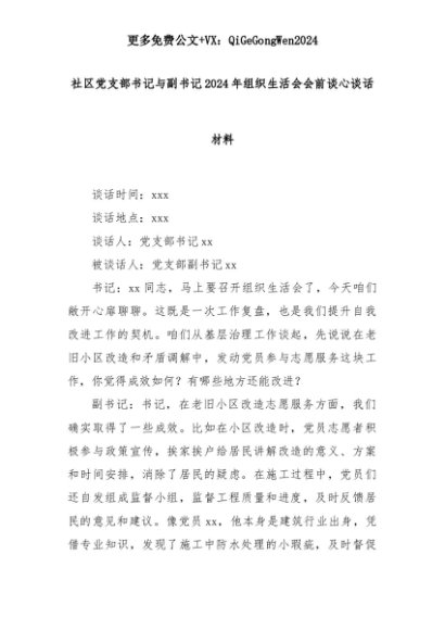 【七哥公文】2025年:社区党支部书记与副书记2024年组织生活会会前谈心谈话材料+更多免费公文+VX:QiGeGongWen2024+更多免费公文+VX:QiGeGongWen2024
