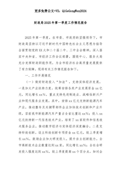 【七哥公文】2025年:财政局2025年第一季度工作情况报告+更多免费公文+VX:QiGeGongWen2024+更多免费公文+VX:QiGeGongWen2024
