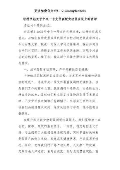 【七哥公文】2025年:驻村书记关于中央一号文件在脱贫攻坚会议上的讲话+更多免费公文+VX:QiGeGongWen2024+更多免费公文+VX:QiGeGongWen2024