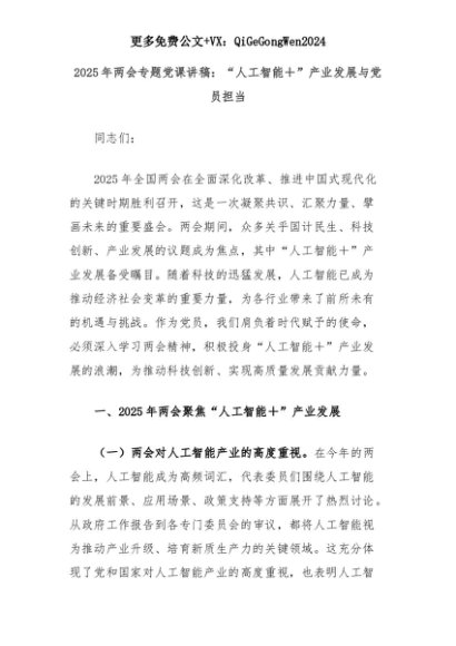 【七哥公文】2025年:2025年两会专题党课讲稿:“人工智能+”产业发展与党员担当+更多免费公文+VX:QiGeGongWen2024+更多免费公文+VX:QiGeGongWen2024