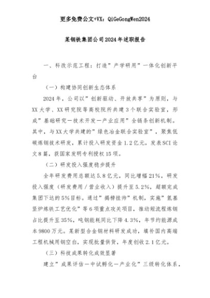 【七哥公文】2025年:某钢铁集团公司2024年述职报告+更多免费公文+VX:QiGeGongWen2024+更多免费公文+VX:QiGeGongWen2024