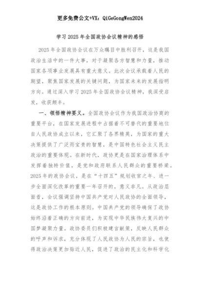 【七哥公文】2025年:学习2025年全国政协会议精神的感悟+更多免费公文+VX:QiGeGongWen2024+更多免费公文+VX:QiGeGongWen2024