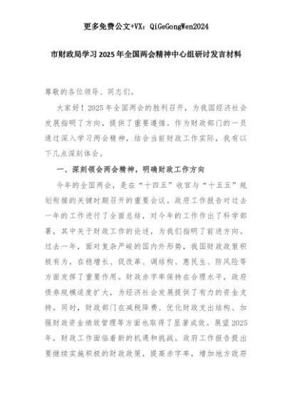 【七哥公文】2025年:市财政局学习2025年全国两会精神中心组研讨发言材料+更多免费公文+VX:QiGeGongWen2024+更多免费公文+VX:QiGeGongWen2024