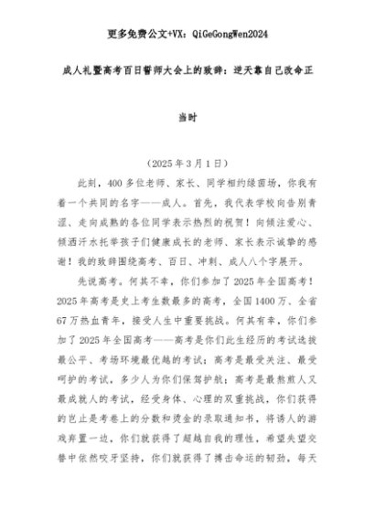 【七哥公文】2025年:成人礼暨高考百日誓师大会上的致辞:逆天靠自己改命正当时+更多免费公文+VX:QiGeGongWen2024+更多免费公文+VX:QiGeGongWen2024
