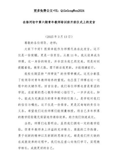 【七哥公文】2025年:在杨河初中第六期青年教师培训班开班仪式上的发言+更多免费公文+VX:QiGeGongWen2024+更多免费公文+VX:QiGeGongWen2024