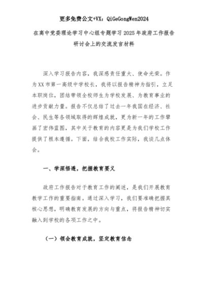 【七哥公文】2025年:在高中党委理论学习中心组专题学习2025年政府工作报告研讨会上的交流发言材料+更多免费公文+VX:QiGeGongWen2024+更多免费公文+VX:QiGeGongWen2024