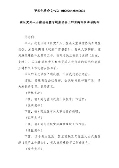 【七哥公文】2025年:在区党外人士座谈会暨专题座谈会上的主持词及讲话提纲+更多免费公文+VX:QiGeGongWen2024+更多免费公文+VX:QiGeGongWen2024
