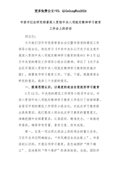 【七哥公文】2025年:市委书记在研究部署深入贯彻中央八项规定精神学习教育工作会上的讲话+更多免费公文+VX:QiGeGongWen2024+更多免费公文+VX:QiGeGongWen2024