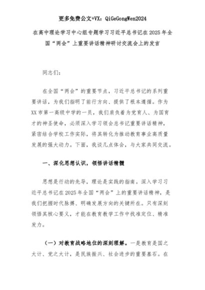 【七哥公文】2025年:在高中理论学习中心组专题学习习近平总书记在2025年全国“两会”上重要讲话精神研讨交流会上的发言+更多免费公文+VX:QiGeGongWen2024+更多免费公文+VX:QiGeGongWen2024