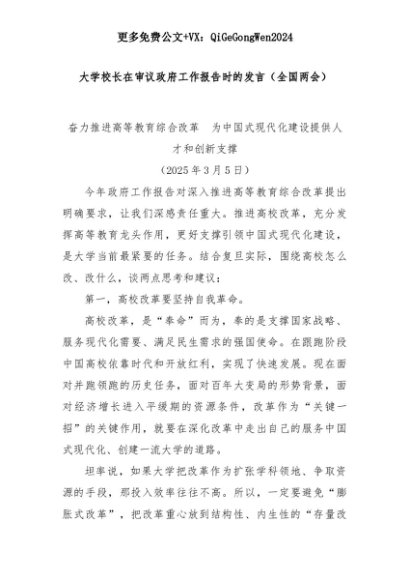 【七哥公文】2025年:大学校长在审议政府工作报告时的发言(全国两会)+更多免费公文+VX:QiGeGongWen2024+更多免费公文+VX:QiGeGongWen2024