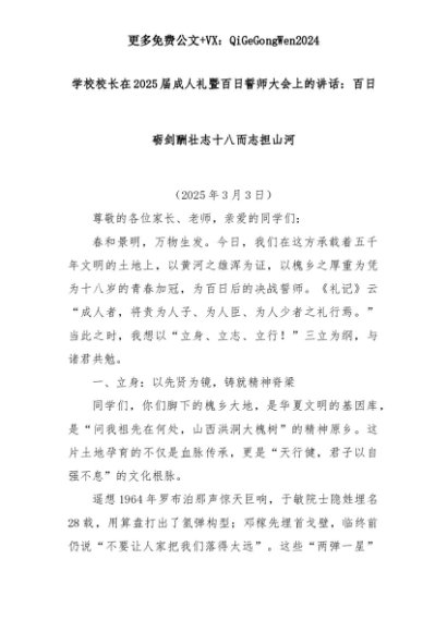 【七哥公文】2025年:学校校长在2025届成人礼暨百日誓师大会上的讲话:百日砺剑酬壮志十八而志担山河+更多免费公文+VX:QiGeGongWen2024+更多免费公文+VX:QiGeGongWen2024