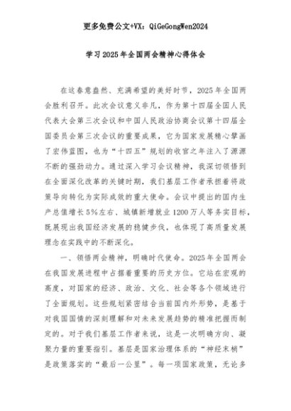 【七哥公文】2025年:学习2025年全国两会精神心得体会+更多免费公文+VX:QiGeGongWen2024+更多免费公文+VX:QiGeGongWen2024