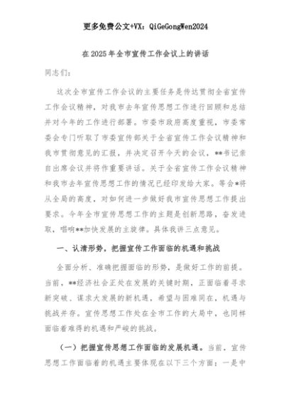【七哥公文】2025年:在2025年全市宣传工作会议上的讲话+更多免费公文+VX:QiGeGongWen2024+更多免费公文+VX:QiGeGongWen2024