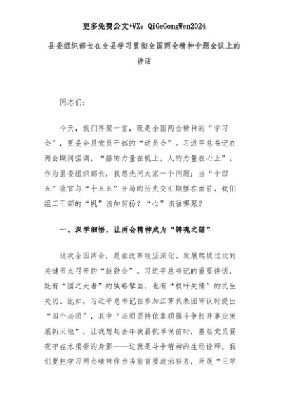【七哥公文】2025年:县委组织部长在全县学习贯彻全国两会精神专题会议上的讲话+更多免费公文+VX:QiGeGongWen2024+更多免费公文+VX:QiGeGongWen2024