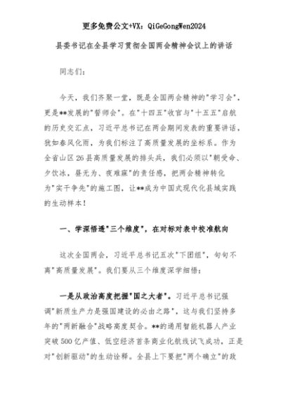 【七哥公文】2025年:县委书记在全县学习贯彻全国两会精神会议上的讲话+更多免费公文+VX:QiGeGongWen2024+更多免费公文+VX:QiGeGongWen2024