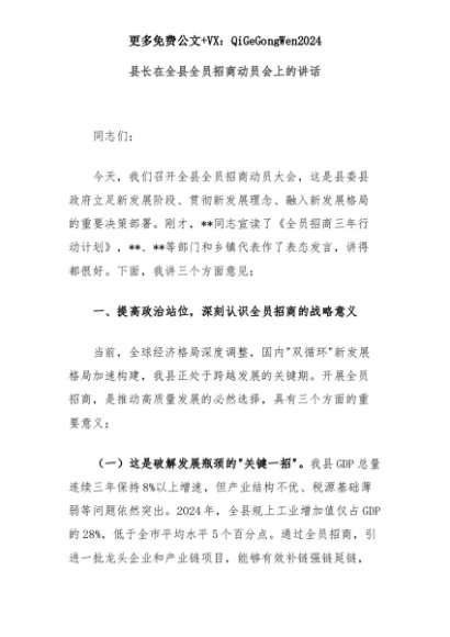 【七哥公文】2025年:县长在全县全员招商动员会上的讲话+更多免费公文+VX:QiGeGongWen2024+更多免费公文+VX:QiGeGongWen2024