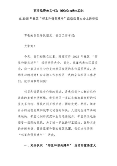 【七哥公文】2025年:在2025年社区“邻里和谐共建年”活动动员大会上的讲话+更多免费公文+VX:QiGeGongWen2024+更多免费公文+VX:QiGeGongWen2024