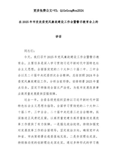 【七哥公文】2025年:在2025年市发改委党风廉政建设工作会暨警示教育会上的讲话+更多免费公文+VX:QiGeGongWen2024+更多免费公文+VX:QiGeGongWen2024