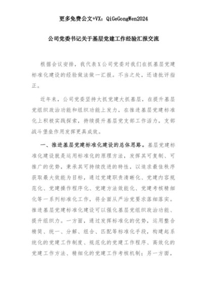 【七哥公文】2025年:公司党委书记关于基层党建工作经验汇报交流+更多免费公文+VX:QiGeGongWen2024+更多免费公文+VX:QiGeGongWen2024