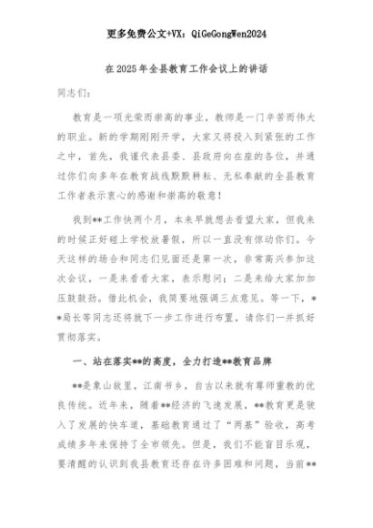 【七哥公文】2025年:在2025年全县教育工作会议上的讲话+更多免费公文+VX:QiGeGongWen2024+更多免费公文+VX:QiGeGongWen2024