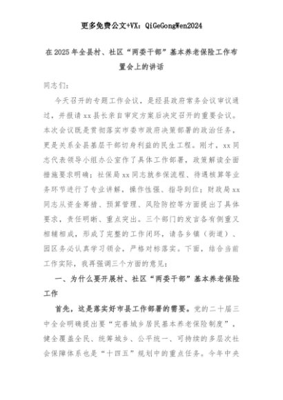 【七哥公文】2025年:在2025年全县村、社区“两委干部”基本养老保险工作布置会上的讲话+更多免费公文+VX:QiGeGongWen2024+更多免费公文+VX:QiGeGongWen2024