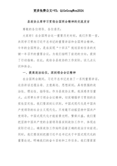 【七哥公文】2025年:县政协主席学习贯彻全国两会精神的交流发言+更多免费公文+VX:QiGeGongWen2024+更多免费公文+VX:QiGeGongWen2024