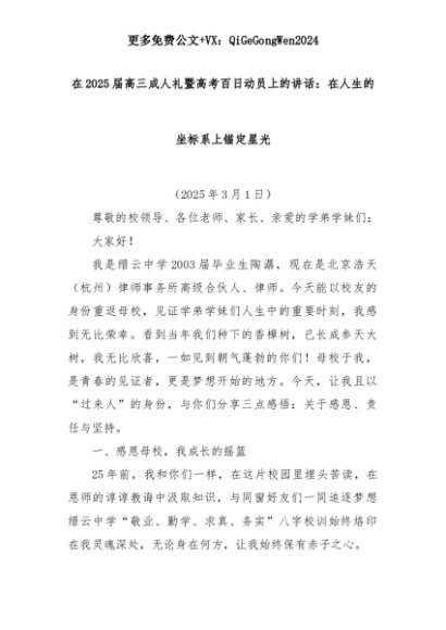 【七哥公文】2025年:在2025届高三成人礼暨高考百日动员上的讲话:在人生的坐标系上锚定星光+更多免费公文+VX:QiGeGongWen2024+更多免费公文+VX:QiGeGongWen2024