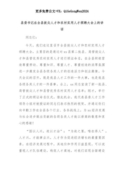 【七哥公文】2025年:县委书记在全县拔尖人才和农村实用人才颁聘大会上的讲话+更多免费公文+VX:QiGeGongWen2024+更多免费公文+VX:QiGeGongWen2024