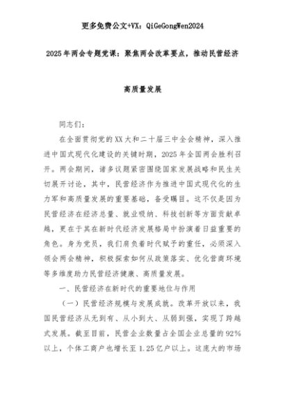 【七哥公文】2025年:2025年两会专题党课:聚焦两会改革要点,推动民营经济高质量发展+更多免费公文+VX:QiGeGongWen2024+更多免费公文+VX:QiGeGongWen2024