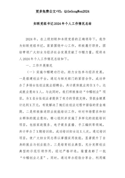 【七哥公文】2025年:妇联党组书记2024年个人工作情况总结+更多免费公文+VX:QiGeGongWen2024+更多免费公文+VX:QiGeGongWen2024