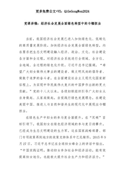 【七哥公文】2025年:党课讲稿:经济社会发展全面绿色转型中的巾帼担当+更多免费公文+VX:QiGeGongWen2024+更多免费公文+VX:QiGeGongWen2024