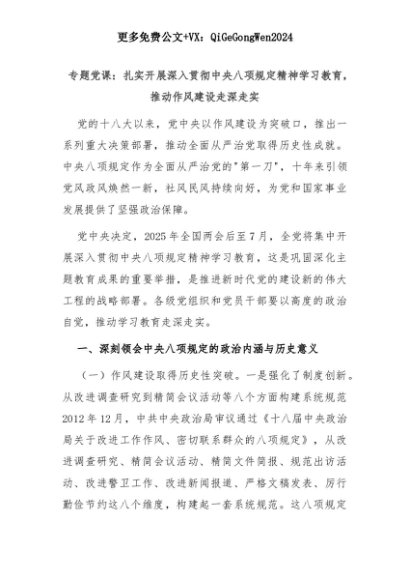 【七哥公文】2025年:专题党课:扎实开展深入贯彻中央八项规定精神学习教育,推动作风建设走深走实+更多免费公文+VX:QiGeGongWen2024+更多免费公文+VX:QiGeGongWen2024