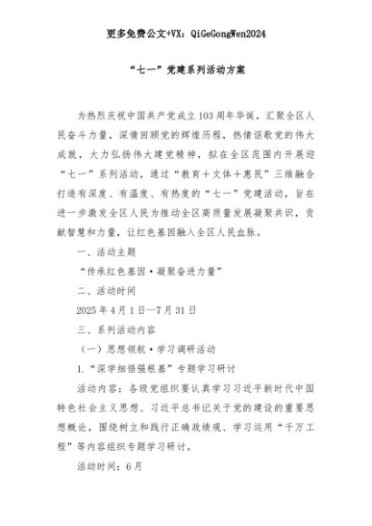 【七哥公文】2025年:“七一”党建系列活动方案+更多免费公文+VX:QiGeGongWen2024+更多免费公文+VX:QiGeGongWen2024